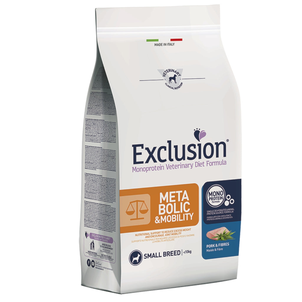 Exclusion Diet Metabolic & Mobility Small Breed è un alimento completo dietetico per cani adulti formulato per la riduzione delleccesso di peso corporeo e per il supporto della funzionalità delle articolazioni in caso in caso di osteoartrite. Questo alimento dietetico contiene alti livelli di EPA, acidi grassi totali Omega-3, vitamina E e ß-glucani. Indicazioni: riduzione delleccesso del peso corporeo e supporto del metabolismo articolare in caso di osteoartrite.
